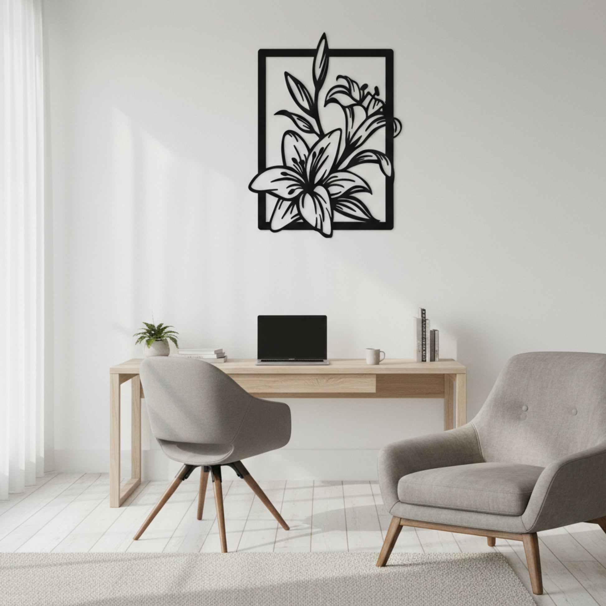 A refined floral line illustration enclosed in a sleek rectangular frame. This wall decor adds softness and elegance without clutter, making it ideal for calm, minimal interiors. The black silhouette creates a striking contrast on light walls while still feeling airy and balanced.