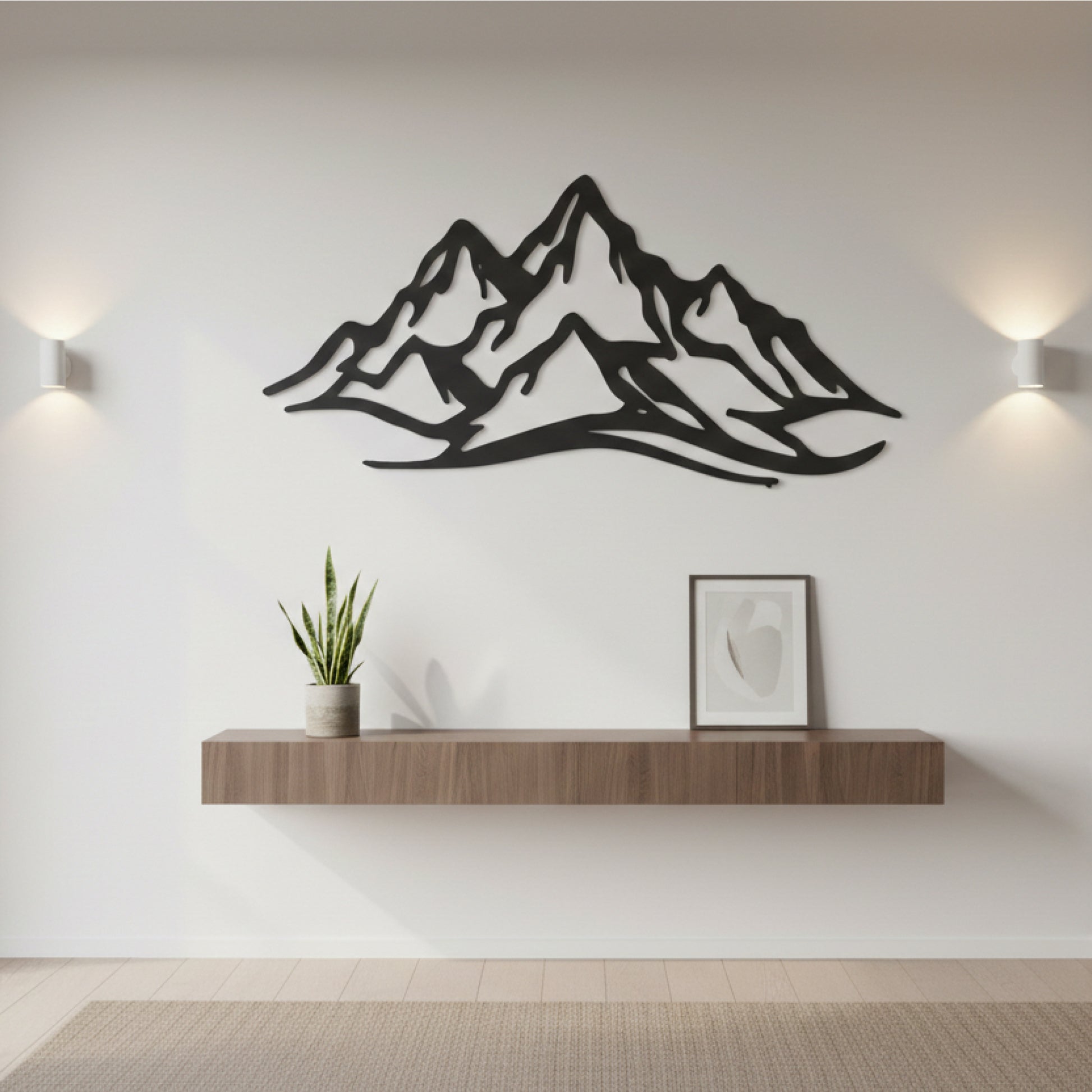 A sleek mountain range silhouette designed with fluid, continuous lines that bring a sense of calm, balance, and escape into your space. This wall decor captures the quiet strength of mountains without visual noise, making it ideal for modern, minimal interiors.